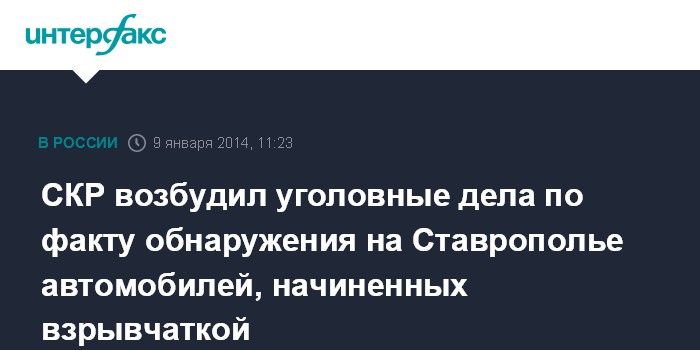 Москва. 9 января. INTERFAX.RU - Уголовные дела по факту обнаружения на Ставрополье автомобилей, начиненных взрывчаткой, возбуждены по "криминальным статьям", хотя следствие рассматривает различные версии произошедшего, сообщил "Интерфаксу" официальный представитель СКР Владимир Маркин.