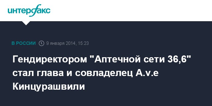 Москва. 9 января. INTERFAX.RU - Акционеры ОАО "Аптечная сеть 36,6" на внеочередном собрании избрали гендиректором компании совладельца и главу аптечной сети A.v.e Group (ООО "Аптека-А.в.е") Владимира Кинцурашвили, передал корреспондент "Интерфакса" с собрания.