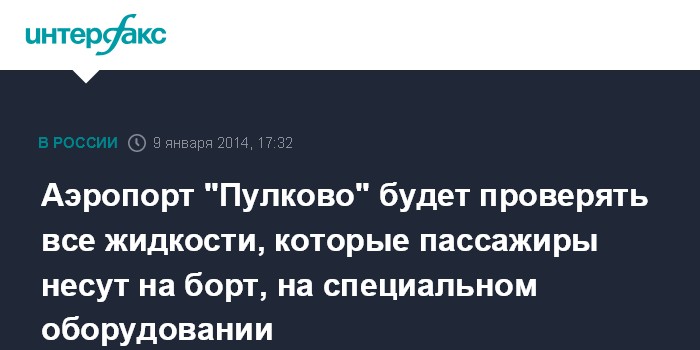Санкт-Петербург. 9 января. INTERFAX.RU - Служба досмотра аэропорта "Пулково" будет предварительно проверять все жидкости, проносимые пассажирами на борт самолетов. По словам собеседника агентства, содержание всех жидкостей будет тестироваться на отсутствие опасных веществ, после чего будет приниматься решение, можно ли пассажиру проносить жидкость в ручной клади. Ограничение начнет действовать в аэропорту в ближайшее время.
