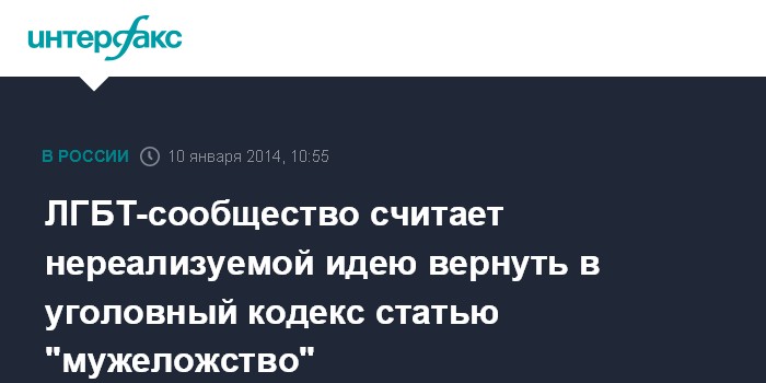 Москва. 10 января. INTERFAX.RU - Один из лидеров российского ЛГБТ-движения Николай Алексеев считает нереализуемой инициативу возвращения в Уголовный кодекс РФ статьи за мужеложство.