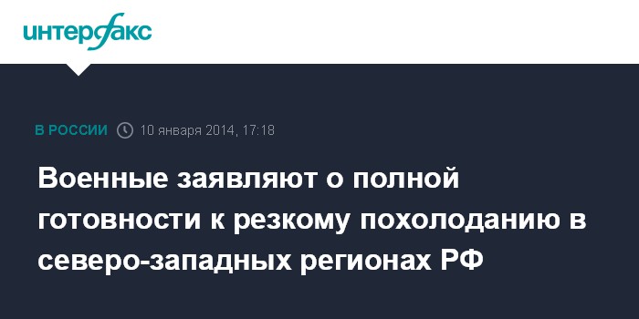 Москва. 10 января. INTERFAX.RU - Объединения, соединения и воинские части Западного военного округа (ЗВО), дислоцированные в Центральном и Северо-Западном федеральных округах полностью готовы к наступлению резкого похолодания, ожидающегося в субботу, заявляют в Минобороны.
