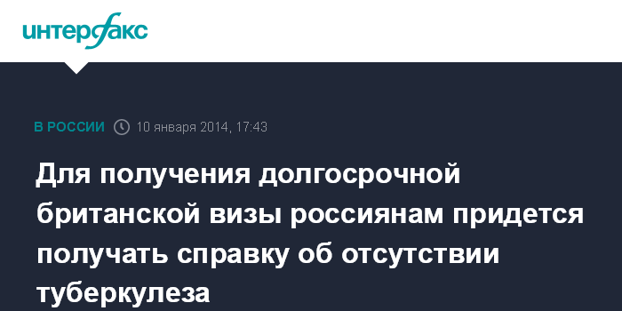Москва. 10 января. INTERFAX.RU - Граждане России, получающие британскую визу с целью долгосрочного пребывания в этой стране, теперь должны проверяться на туберкулез, сообщает МИД РФ.