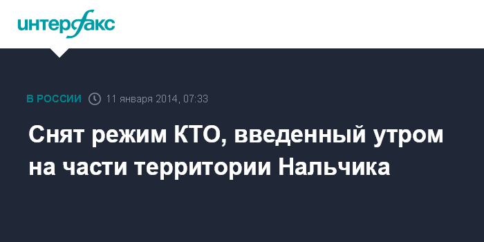 Нальчик. 11 января. ИНТЕРФАКС-ЮГ - Отменен режим контртеррористической операции на части территории города Нальчика, сообщает в субботу Оперативный штаб в Кабардино-Балкарской Республике.
