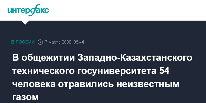Астана. 7 марта. ИНТЕРФАКС-КАЗАХСТАН - Массовое отравление произошло в общежитии Западно-Казахстанского государственного технического университета в Уральске (адмцентр Западно-Казахстанской области).