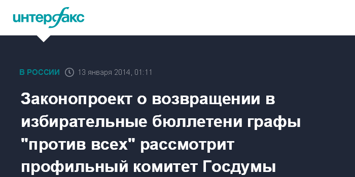 Москва. 13 января. ИНТЕРФАКС - Комитет Госдумы по конституционному законодательству и госстроительству на заседании в понедельник рассмотрит законопроект, предлагающий вернуть графу "против всех" в бюллетени на выборах.