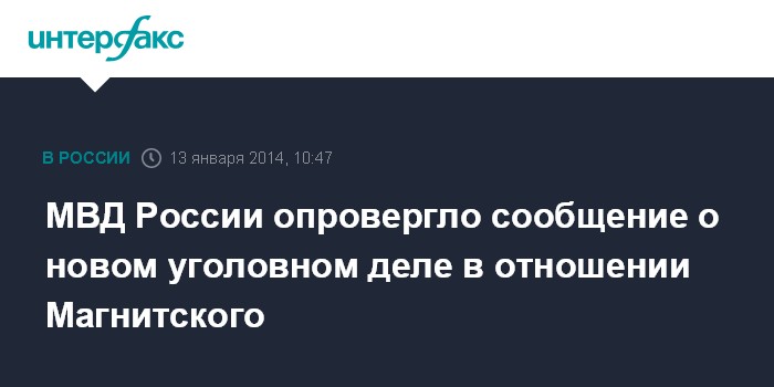 Москва. 13 января. INTERFAX.RU - МВД России опровергло информацию фонда Hermitage Capital о том, что в отношении сотрудника фонда Сергея Магнитского, умершего в 2009 году в московском следственном изоляторе, возбуждено новое уголовное дело.