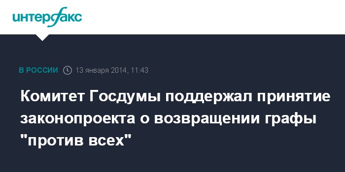 Москва. 13 января. INTERFAX.RU - Комитет Госдумы по конституционному законодательству и госстроительству на заседании в понедельник рекомендовал нижней палате парламента в пятницу, 17 января, принять в первом чтении законопроект, предлагающий вернуть графу "против всех" в бюллетени на выборах.