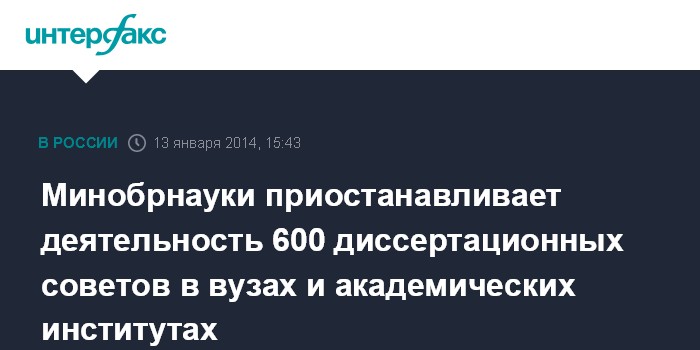 Москва. 13 января. INTERFAX.RU - Минобрнауки России приостановило деятельность более шести сотен диссертационных советов по различным специальностям в десятках академических институтов и российских университетов по всей стране.