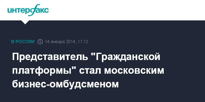 Москва. 14 января. INTERFAX.RU - Руководитель московского отделения партии "Гражданская платформа" Михаил Вышегородцев назначен бизнес-омбудсменом по Москве, сообщили "Интерфаксу" в пресс-службе партии во вторник.