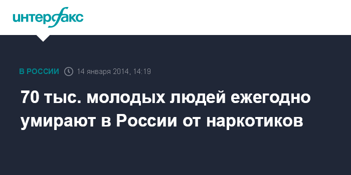 Москва. 14 января. INTERFAX.RU - До 70 тыс. молодых людей в возрасте от 15 до 34 лет ежегодно умирают в России от наркотиков, сообщил глава ФСКН Виктор Иванов.