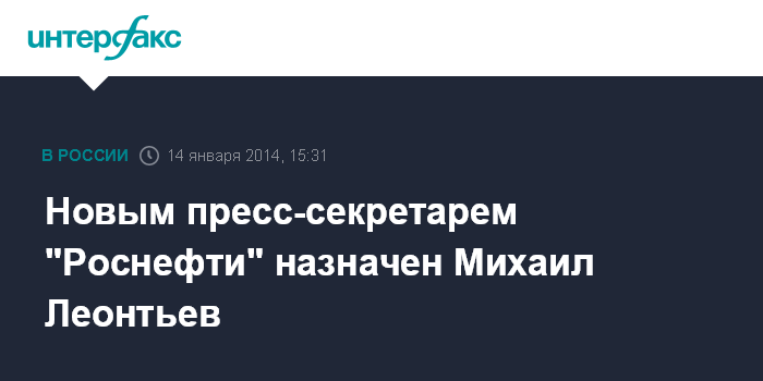 Москва. 14 января. INTERFAX.RU - Журналист Михаил Леонтьев назначен на должность пресс-секретаря - директора департамента информации и рекламы в ранге вице-президента НК "Роснефть".