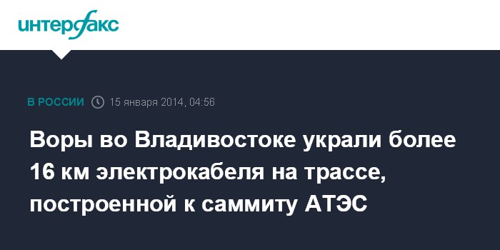 Москва. 15 января. INTERFAX.RU - Неизвестные похитили более 16 километров электрического кабеля, оставив без освещения трассу "Седанка -Патрокл" во Владивостоке, построенную к саммиту АТЭС, сообщает в среду пресс-служба администрации Приморья со ссылкой на краевой департамент дорожного хозяйства.