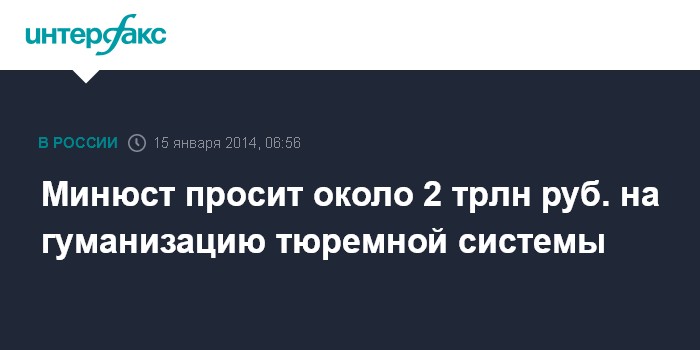 Москва. 15 января. INTERFAX.RU - Минюст России предлагает выделить в ближайшие 7 лет около 1,9 трлн рублей на гуманизацию условий содержания заключенных, их адаптацию после освобождения, а также укрепление престижа работы в местах лишения свободы.