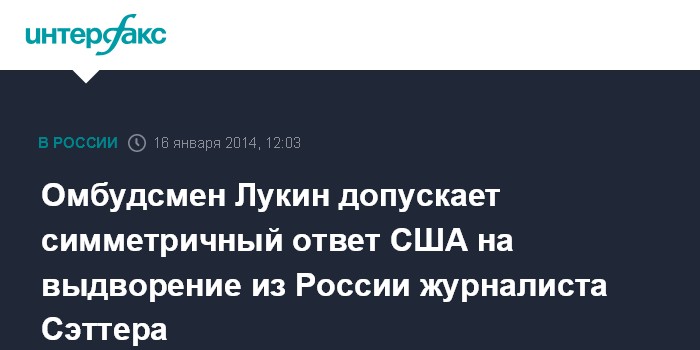 Москва. 16 января. INTERFAX.RU - Уполномоченный по правам человека в РФ Владимир Лукин считает, что США могут пойти на ответные меры после выдворения из России журналиста Дэвида Сэттера.