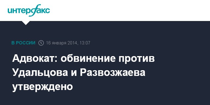 Москва. 16 января. INTERFAX.RU - Генпрокуратура вновь утвердила обвинительное заключение в отношении оппозиционеров Сергея Удальцова и Леонида Развозжаева, обвиняемых в организации массовых беспорядков, сообщил адвокат.