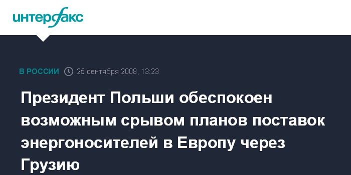 Москва. 25 сентября. INTERFAX.RU - Президент Польши Лех Качиньский считает, что если России удастся сорвать планы диверсификации поставок в Европу энергоносителей через Грузию, это будет жестоким ударом для его страны. Эту мысль он высказал в среду в разговоре с журналистами, аккредитованными на продолжающейся в Нью-Йорке сессии Генеральной Ассамблеи ООН. В своих замечаниях политик делал упор на последствиях августовской операции российских войск по принуждению Грузии к миру.