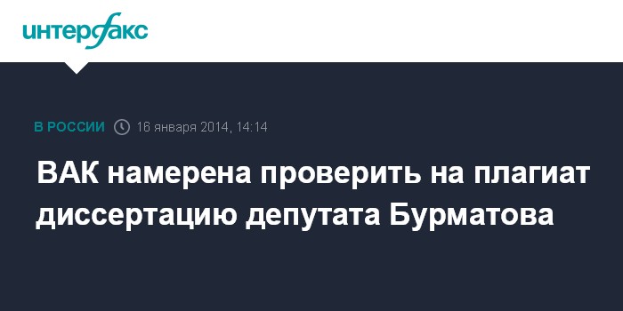 Москва. 16 января. INTERFAX.RU - Диссертация депутата Госдумы Владимира Бурматова будет проанализирована на предмет наличия плагиата учеными экспертами и направлена в диссертационный совет, где защищался парламентарий, заявил председатель Высшей аттестационной комиссии Владимир Филиппов в четверг.