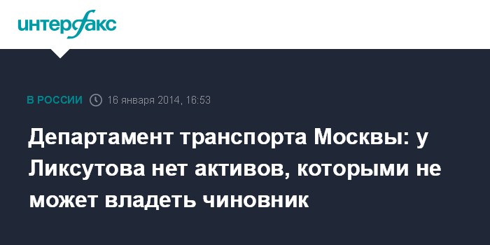Москва. 16 января. INTERFAX.RU - Руководитель департамента транспорта и развития дорожно-транспортной инфраструктуры Москвы Максим Ликсутов не располагает активами, которыми не имеет право владеть российский чиновник, заявили в пресс-службе департамента.