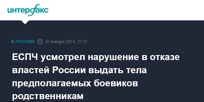 Речь идет о четырех исковых заявлениях жителей Северного Кавказа, в которых оспаривался отказ властей РФ выдать тела их родственников, подозреваемых в терроризме и ликвидированных в ходе контртеррористических операций. Российские власти мотивировали свой отказ положениями российского антитеррористического законодательства, которое предусматривает запрет на выдачу тел убитых боевиков их родственникам, отмечается в пресс-релизе.