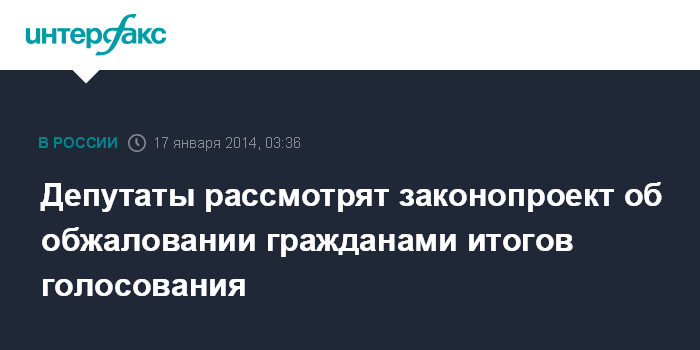 Москва. 17 января. ИНТЕРФАКС - Госдума в пятницу рассмотрит в первом чтении правительственный законопроект об обжаловании гражданами итогов голосования на выборах в РФ.