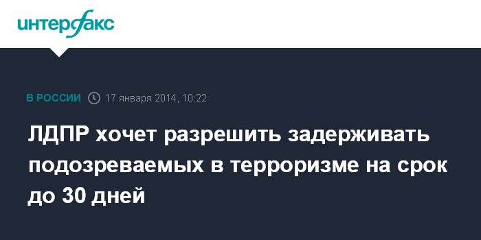 Москва. 17 января. INTERFAX.RU - Фракция ЛДПР готовит предложение об увеличении срока, на который может задерживаться без санкции суда подозреваемый в терроризме.