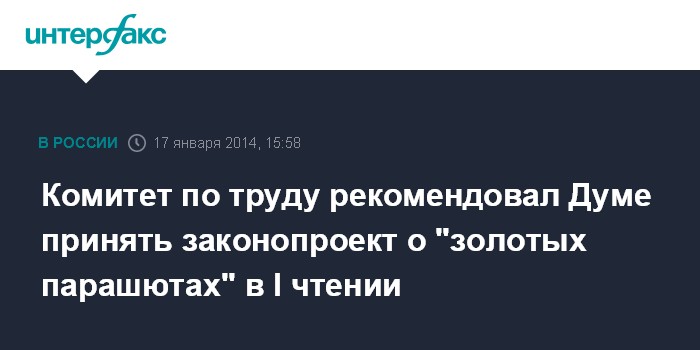 Москва. 17 января. INTERFAX.RU - Комитет Госдумы по труду, социальной политике и делам ветеранов рекомендовал нижней палате принять в первом чтении законопроект, ограничивающий так называемые золотые парашюты для руководителей госкорпораций шестикратным средним месячным заработком.