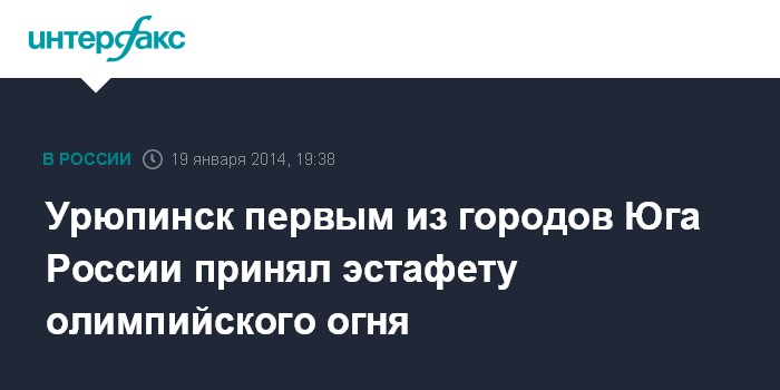 Москва. 19 января. INTERFAX.RU - Урюпинск стал первым из городов Южного федерального округа, где 60 факелоносцев пронесли огонь сочинской Олимпиады, сообщил с места события корреспондент агентства "Интерфакс-Юг" в воскресенье.