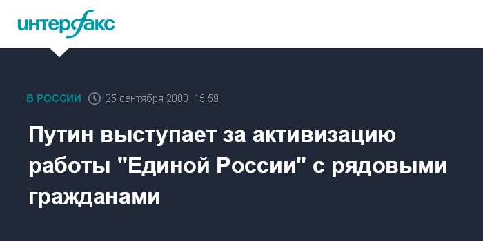 Москва. 25 сентября. INTERFAX.RU - Премьер РФ, лидер "Единой России" Владимир Путин считает, что региональные отделения этой партии должны основное внимание уделять реальной работе с людьми, помощи нуждающимся. "От региональных организаций мы ждем больших усилий по выстраиванию системы адресной помощи пенсионерам, ветеранам, инвалидам. Нужно расширять программы, нацеленные на молодежь, на поддержку спорта, образования, малого и среднего предпринимательства. Оказывать широкую правовую поддержку гражданам", - заявил Путин на встрече с секретарями региональных отделений и руководителями фракций в региональных заксобраниях.
