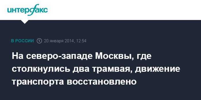 Москва. 20 января. INTERFAX.RU - Движение трамваев на северо-западе Москвы, прерванное из-за столкновения двух трамваев, восстановлено, сообщили "Интерфаксу" в управлении ГИБДД Москвы.