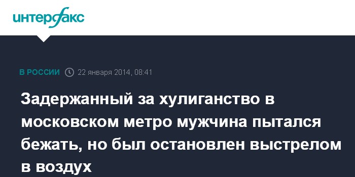 Москва. 22 января. INTERFAX.RU - Столичным полицейским пришлось стрелять в воздух, чтобы предотвратить попытку побега мужчины, задержанного за хулиганство в московском метро, сообщил "Интерфаксу" начальник управления информации и общественных связей ГУ МВД России по Москве Андрей Галиакберов.