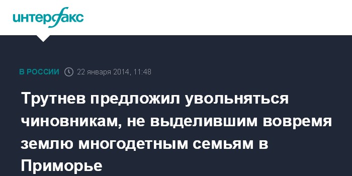 Москва. 22 января. INTERFAX.RU - Заместитель председателя правительства России - полпред президента в Дальневосточном федеральном округе Юрий Трутнев в ходе начавшегося во Владивостоке совещания по вопросам выделения земли многодетным родителям, предложил добровольно уйти в отставку тем чиновникам, кто не уложится в сроки исполнения закона.