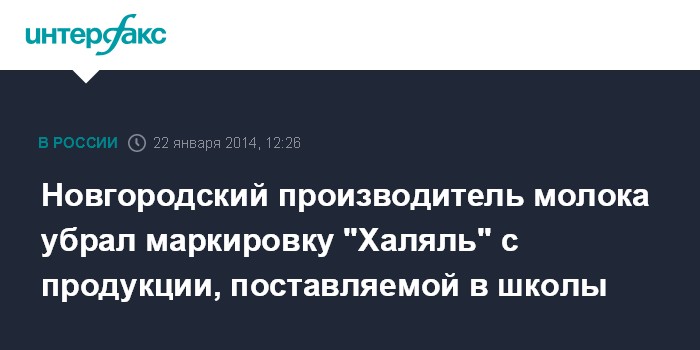 Москва. 22 января. INTERFAX.RU - Поставщик молока ЗАО "Лактис" перестал маркировать продукцию, поставляемую в новгородские школы, изображением символа сертификата соответствия "Халяль" международного центра стандартизации и сертификации Совета муфтиев России, содержащего религиозные символы.