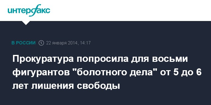 Москва. 22 января. INTERFAX.RU - Прокуратура в ходе прений попросила Замоскворецкий суд приговорить восьмерых фигурантов дела о массовых беспорядках на Болотной площади в столице к срокам от 5 до 6 лет лишения свободы.
