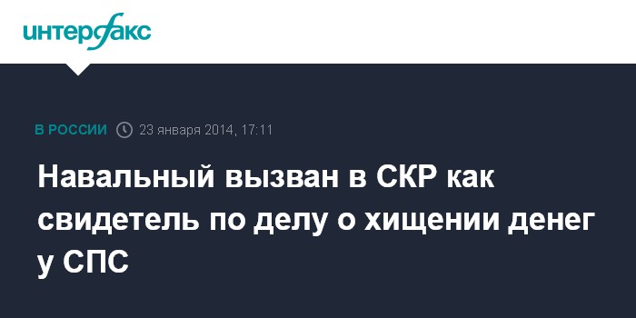 Москва. 23 января. INTERFAX.RU - Оппозиционер Алексей Навальный вызван повесткой на допрос в качестве свидетеля по делу о хищении денежных средств у партии СПС, сообщили "Интерфаксу" в пресс-службе СКР. "Навальный вызван в СКР на 31 января этого года по делу о хищении денег у партии СПС как свидетель", - сообщили "Интерфаксу" в пресс-службе Следственного комитета.