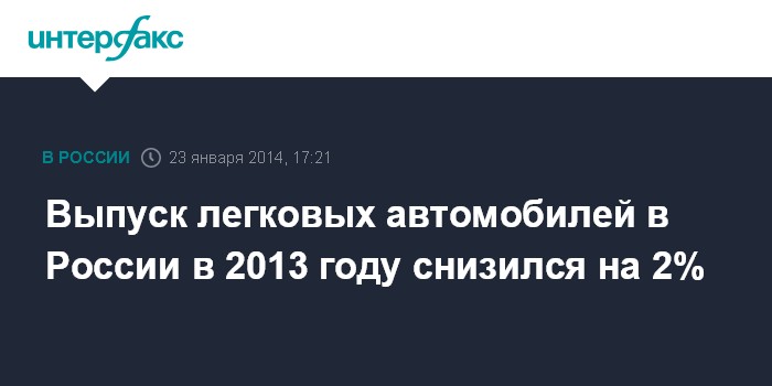Москва. 23 января. INTERFAX.RU - Производство легковых автомобилей в России в 2013 г. сократилось на 2% по сравнению с 2012 годом - до 1,9 млн единиц.