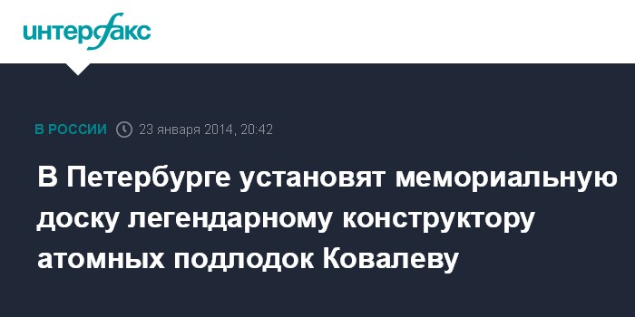 Москва. 23 января. INTERFAX.RU - Депутаты Петербурга поддержали предложение губернатора Георгия Полтавченко об установке мемориальной доски конструктору атомных подлодок Сергею Ковалеву, сообщает пресс-служба Заксобрания.