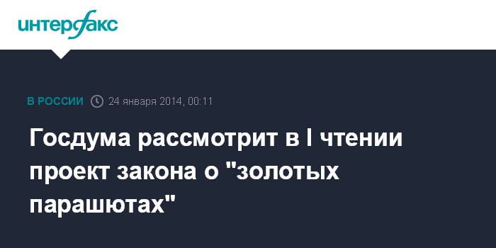 Москва. 24 января. INTERFAX.RU - Госдума в пятницу рассмотрит в первом чтении законопроект, ограничивающий "золотые парашюты" для руководителей госкорпораций шестикратным средним месячным заработком.