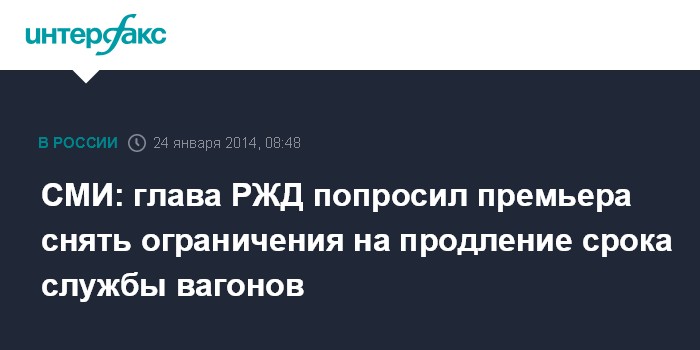 Москва. 24 января. INTERFAX.RU - Президент ОАО "Российские железные дороги" (РЖД) Владимир Якунин просит премьер-министра РФ Дмитрия Медведева отменить ограничения по продлению срока службы вагонов (с апреля 2013 г. это можно делать только на один год), а также предотвратить новые, связанные с вступлением в августе в силу технического регламента Таможенного союза.