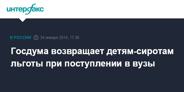 Москва. 24 января. INTERFAX.RU - Госдума в пятницу приняла в третьем, окончательном, чтении законопроект о возвращении льгот для детей-сирот при поступлении в вузы.