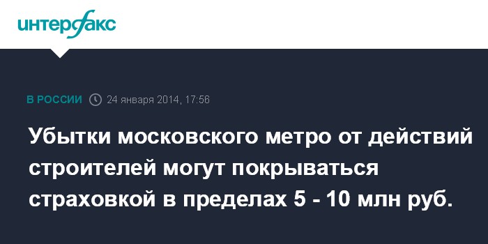 Москва. 24 января. INTERFAX.RU - Убытки Московского метрополитена от действий строителей, пробивших сваей дыру в тоннеле метро 22 января, могут покрываться в пределах 5 - 10 млн рублей по полису страхования ответственности строителей, сообщили агентству "Интерфакс" в компаниях, специализирующихся в том числе на страховании таких рисков.