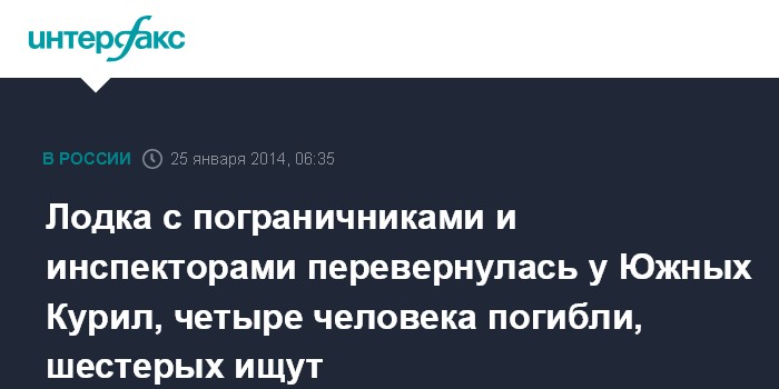 Москва. 25 января. INTERFAX.RU - Лодка с сотрудниками пограничной службы и государственной морской инспекции (ГМИ) перевернулась вечером в пятницу в море возле острова Кунашир (Южные Курилы) Сахалинской области, сообщили агентству "Интерфакс-Дальний Восток" в Южно-Курильской районной администрации.