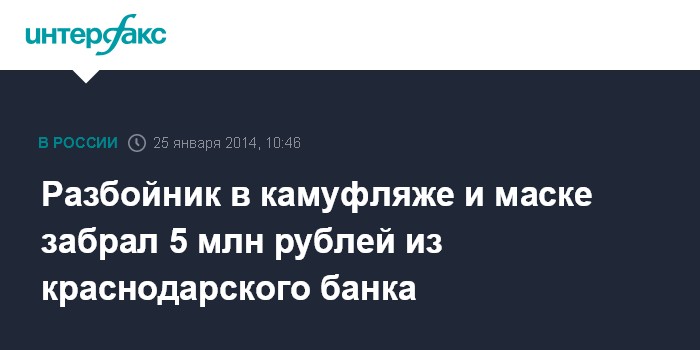 Разбойник в камуфляже и маске забрал 5 млн рублей из краснодарского банка