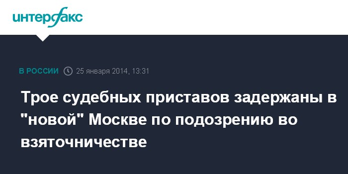 Москва. 25 января. INTERFAX.RU - Три сотрудника столичного Управления Федеральной службы судебных приставов в "новой" Москве задержаны по подозрению в получении 1 млн 251 тыс. рублей в качестве взятки от соучредителя строительной компании, сообщили "Интерфаксу" в субботу в пресс-службе ГУ МВД РФ по Москве.