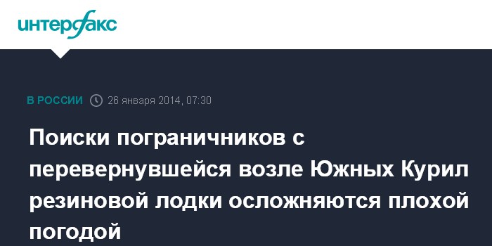 Москва. 26 января. INTERFAX.RU - Поиски пограничников с перевернувшейся в пятницу вечером резиновой лодки в море возле Южных Курил продолжаются.