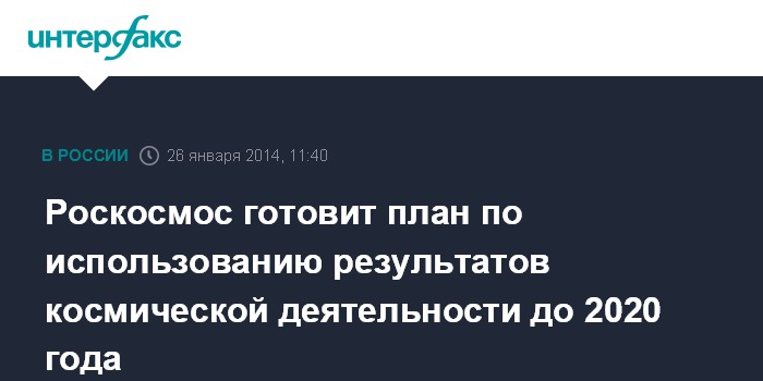 Москва. 26 января. INTERFAX.RU - Роскосмос готовит план по использованию результатов космической деятельности до 2020 года, сообщает пресс-служба ведомства.