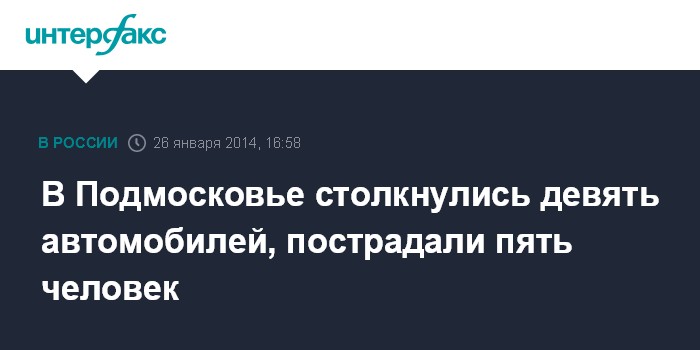 Москва. 26 января. INTERFAX.RU - Пять человек получили ранения в результате крупного ДТП в Подмосковье. "По предварительным данным в 14:50 на 1-ом километре Малого Московского кольца Каширо-Симферопольского шоссе произошло столкновение девяти транспортных средств. Столкнулись грузовик МАН, Рэндж Ровер, Мицубиси, микроавтобус Ссанг Енг, БМВ, Лэнд Крузер, Шевроле Лачетти, Шевроле Спарк и Форд Фокус", - сообщили "Интерфаксу" в воскресенье в пресс-службе ГИБДД Московской области.