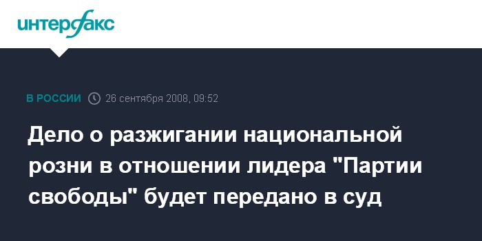 Москва. 26 сентября. INTERFAX.RU - В Санкт-Петербурге завершено расследование уголовного дела в отношении лидера запрещенной партии, который обвиняется в разжигании межнациональной розни, сообщили "Интерфаксу" в СКП РФ в пятницу.