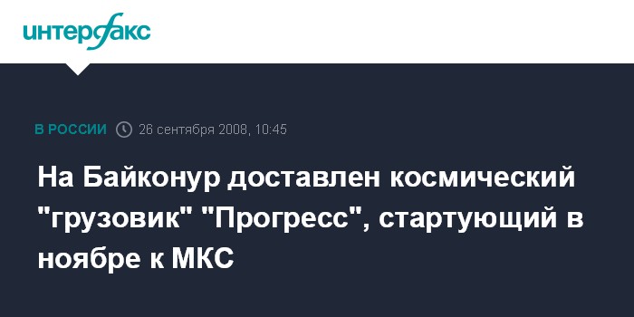 Москва. 26 сентября. INTERFAX.RU – На Байконур утром в пятницу прибыл железнодорожный состав, который доставил с российского завода экспериментального машиностроения РКК "Энергия" имени Королева грузовой космический транспортный корабль "Прогресс", сообщил агентству "Интерфакс-Казахстан" источник на космодроме.