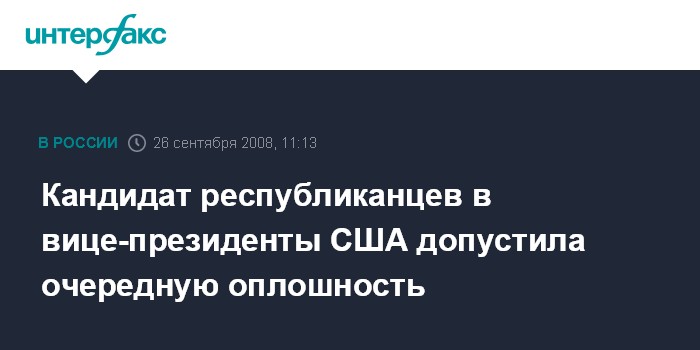 Москва. 26 сентября. INTERFAX.RU – Губернатор штата Аляска Сара Пэйлин, являющаяся кандидатом республиканской партии США на пост вице-президента, допустила в интервью телевидению очередную оплошность, что начинает отражаться на ее рейтингах.