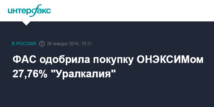 Москва. 28 января. INTERFAX.RU - Федеральная антимонопольная служба (ФАС) одобрила ходатайство ряда компаний, входящих в группу ОНЭКСИМ, о покупке 27,76% голосующих акций ОАО "Уралкалий", говорится в сообщении ведомства.